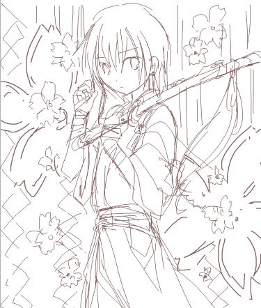 たすきがけした着物姿を描いてます。一回描いてみたいんですよ、たすきがけ。